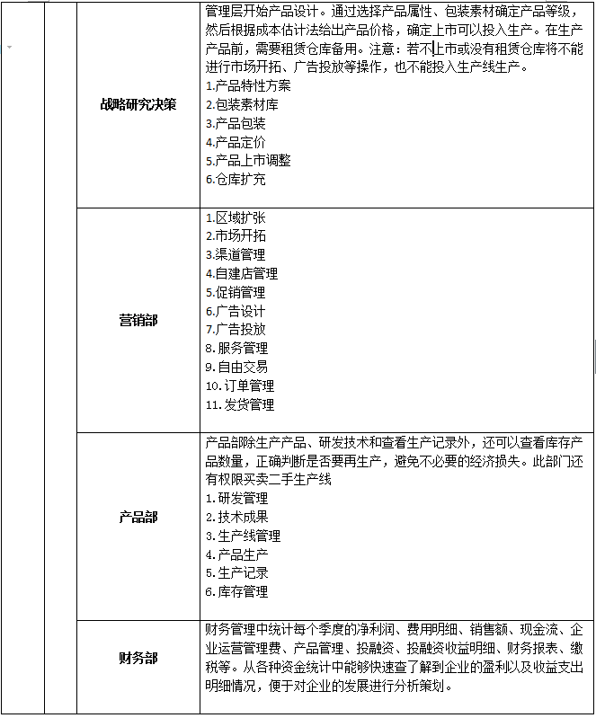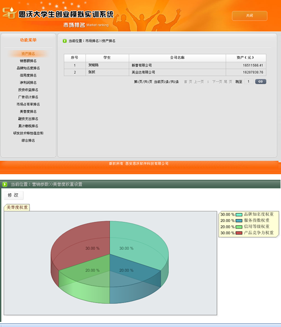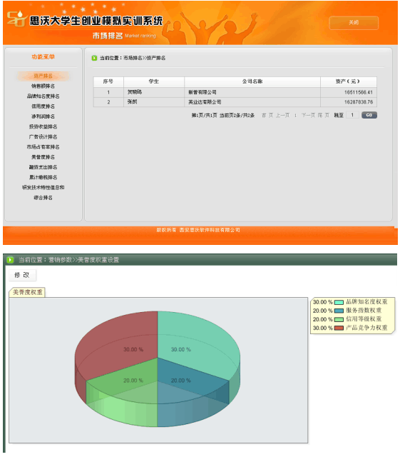 5、系統具有自(zi)動(dong)計(ji)(ji)分和(he)手(shou)動(dong)評分功能。自(zi)動(dong)計(ji)(ji)分以各方面排(pai)名(ming)(ming)(ming)(ming)的形式,包括(kuo)資金排(pai)名(ming)(ming)(ming)(ming)、銷售排(pai)名(ming)(ming)(ming)(ming)、知名(ming)(ming)(ming)(ming)度排(pai)名(ming)(ming)(ming)(ming)、利潤排(pai)名(ming)(ming)(ming)(ming)、投(tou)資收益排(pai)名(ming)(ming)(ming)(ming)、廣告(gao)設計(ji)(ji)排(pai)名(ming)(ming)(ming)(ming)、市場(chang)占有率(lv)排(pai)名(ming)(ming)(ming)(ming)、美(mei)譽度排(pai)名(ming)(ming)(ming)(ming)、投(tou)融資收益排(pai)名(ming)(ming)(ming)(ming)、累計(ji)(ji)繳稅排(pai)名(ming)(ming)(ming)(ming)、綜合排(pai)名(ming)(ming)(ming)(ming)等(deng)。教(jiao)師可以批閱學生所提(ti)交的計(ji)(ji)劃書、廣告(gao)設計(ji)(ji)、市場(chang)調查分析、公司制度等(deng)。
