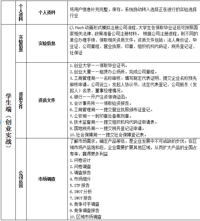 學生端模(mo)擬現(xian)實創(chuang)業的步(bu)驟及相關流程(cheng)進行創(chuang)業實驗。